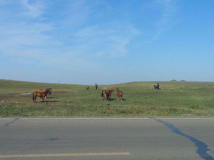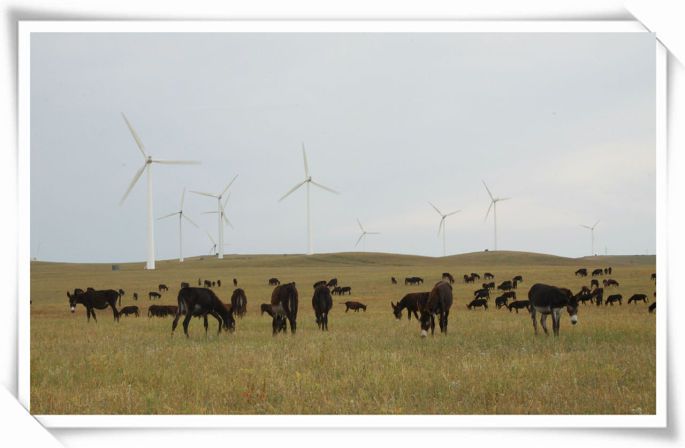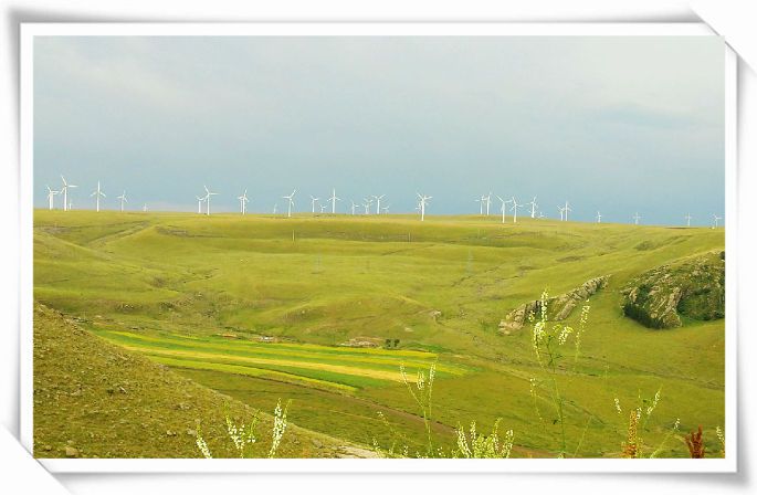 高山慢慢地在脚下延伸,路边渐渐只现草原,绿色中总是掺杂着黄色,好像旱情也曾光临这里,似乎还没有离开。风车----风力发电机闯进视野。白色的风车忽然就稀疏地点缀在草原上。一个个窈窕身姿,三个叶片在悠悠然地转动着。 路边不时地有马群在甩着尾巴,或低头吃草或凝视张望着形色匆匆的车辆,悠闲中等待着生意。这就是辉腾锡勒草原——“寒冷的高原”。