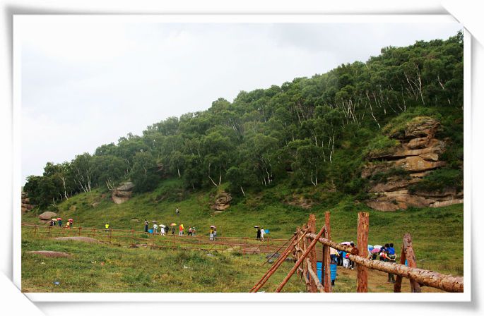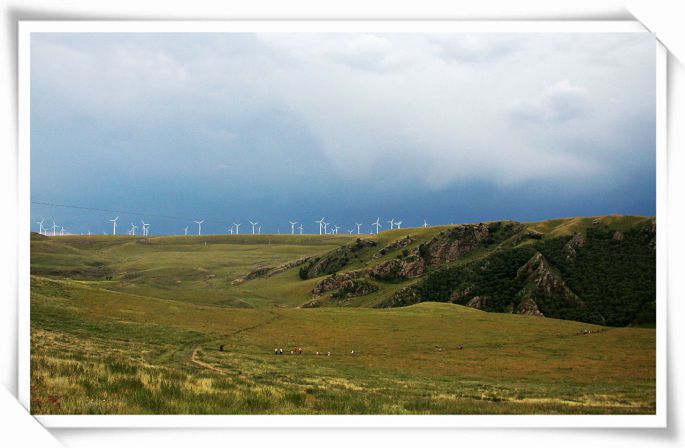 顺着山势向下漫延的小路上布满了游人。路尽峰转,谷底的湖泊甚是可怜见的,只剩下涓涓细流在喘气,全然没有草原上小江南的感觉。草原上缺水,一切都失色。转到索道处,看着那边群山绵延,全都披盖着草场,真想爬上去看风景,可是索道票怎么办呢?天公作美,飘来一团乌云层,电闪雷鸣。索道举起白旗,应声停运,可以无条件退索道票。 欧耶,太体谅人了。雷声大,雨点小,说的一点不错。雨滴应付了一会儿,就溜走了。顺着山坡向上爬,自由地呼吸,欢呼地跳跃,让眼睛饱览着风车装点的草原。那片树林是草原上最绿的夏天,没有因为缺水提前穿上秋色。终点又回到起点,黄花沟景区里就是一条环线,大概四公里,悠闲地下山上山,坡度不大,大不必坐索道。两个半小时足够了。最美的景色是在景区北门入门后左手边。