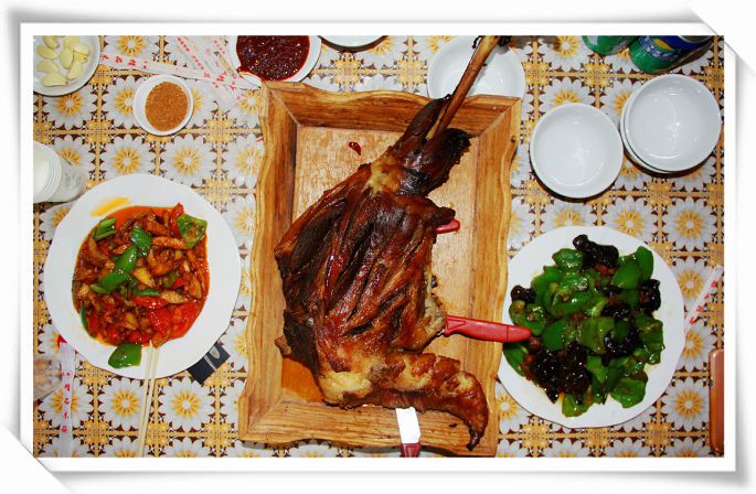 晚餐闪亮登场,一只烤了两个小时的大羊腿 。像模像样地戴上手套,拿起刀子,我自横刀向羊腿,嘿嘿。草原上的烤羊腿确实好吃哦,热乎乎地,外焦里嫩,没有嗤鼻的膻味。羊腿孤寂地躺在木盘里享受被我们享用时刻的赞叹。晚餐烤羊腿,两盘菜,570元。