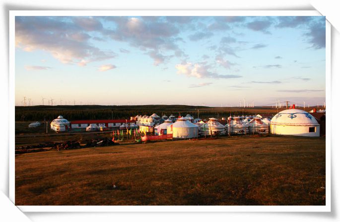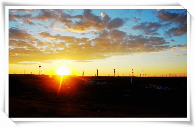 一早小伙伴叫大家起来看日出。我们超音速地从床上奔上汽车,冲上小山头。太阳起的比我们早,地平线就要被它挣脱了。初升的阳光热情地拥抱草原,到处是红光满面。天边被晕染的橘红,白云羞红了脸悬挂在空中,远处林林立立一个个风车的剪影,草原披着红纱衣,蒙包还在晨睡之中。一个清凉安静的早晨却分明给我们豪情万丈,热情扑面的感觉。这就是草原的早晨,暖暖的,极温馨的。