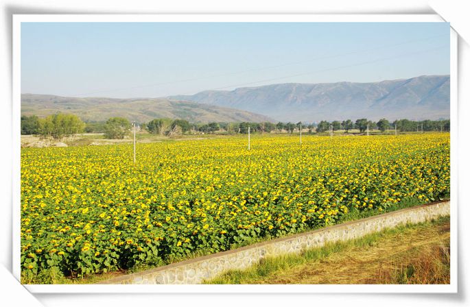一早在卓资吃过早饭(24元),8:00时候就向草原方向驶去。或许是来草原的人一年多于一年,唯一的道路X560正在做扩身运动。车行一会儿就看到路边有成片的向日葵园地。路右边的葵花统一给我们个背影,让我们想象葵花的样子。路左边的向日葵向我们展示最灿烂的花盘。它们都在虔诚地向太阳致敬。远处的山清秀且阴阳顿挫的分明,一点也不见草原的痕迹。