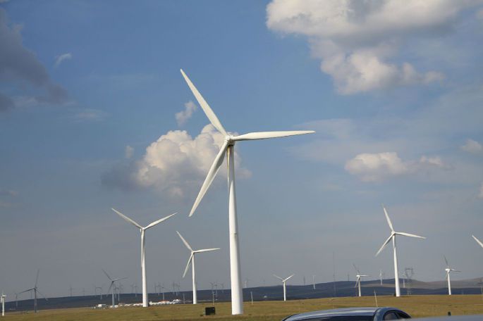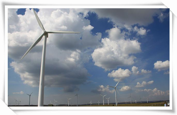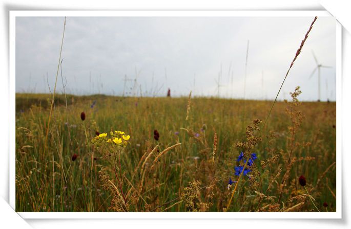 再次全身心的投入草原。没有参照物的草原,起起伏伏,一直到天尽头。走近了风力发电机才看出它粗壮的根基,没有六七人伸开双臂是抱不住的。站在下面仰视着这个庞然巨人,每一个叶片足有十几米长。风车竟然这么大!在草原上,视觉迷失在广阔天地里。风车在眼睛里有些缩水,百米之外哪里会有这感觉。突然风车发车很大异常的声音,心中一惊,赶快跑。声音缓缓地又正常了,抬头看看,刚才流线型的叶片前端发生了变形,三叶片现在就像是三支箭。原来是风力大的时候,叶片变形减速。虚惊一场噢!