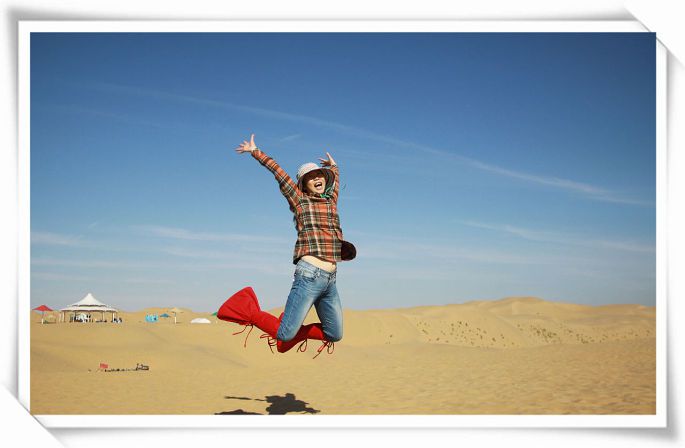 恢复了体力,游玩的兴趣又来了,骑骆驼去。沙漠里的驼队,怎么看都有感觉。一驼队来了,领队拍拍头陀,它就温顺地跪倒在地,接着第二匹,第三匹......换上一匹客人,驼队就挨着顺序起来,谁也不着急,如此教导有方。坐上骆驼的,还在等待的都急着摆POSE拍照,掩饰不住的兴奋漫延在每个人的神经里。