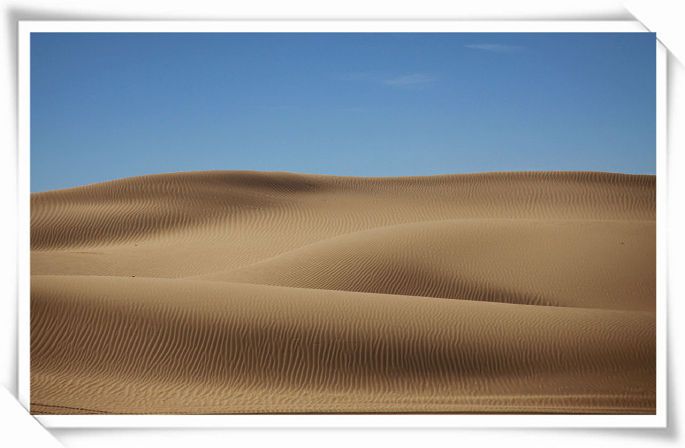 开足马力,车头矗立的小旗呼啦啦地招展着,冲浪车轰隆隆地跑起来驶向仙沙岛。这时候我们四周全是沙丘,视线越不过沙子,实实在在地处在沙漠里。无人试足的沙丘只有风匆匆行过留下的涟漪,沙波一曲,婉转清幽。一车人都兴奋起来,各式武器拍个不停。