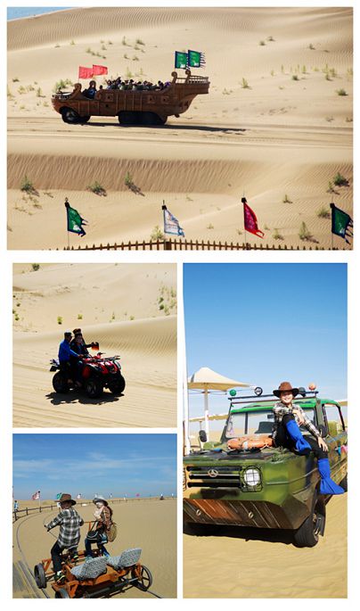 高空滑索这时候就要排队了,耽误了不少时间,我们又把一号二号滑索体验一把。好了,就这样吧。乘坐”海盗船“回到起点,还有水陆两栖车,每人60元。司机尽挑坡度大的沙丘冲下去,感觉车子快控制不住就要做体操腾空翻了,忽就四轮着地了,冲着沙丘就咆哮着爬上去。一会儿又忽地跳进水塘里,咕嘟咕嘟地旋着藏在身后的桨片,欢快地游泳。该走了,做着滑板从百米高的沙丘上滑下来,风在耳边呼呼叫着,心由最初的一丝胆怯到小心翼翼转成放松体验。。。“啊”着滑下去。(滑沙20元)