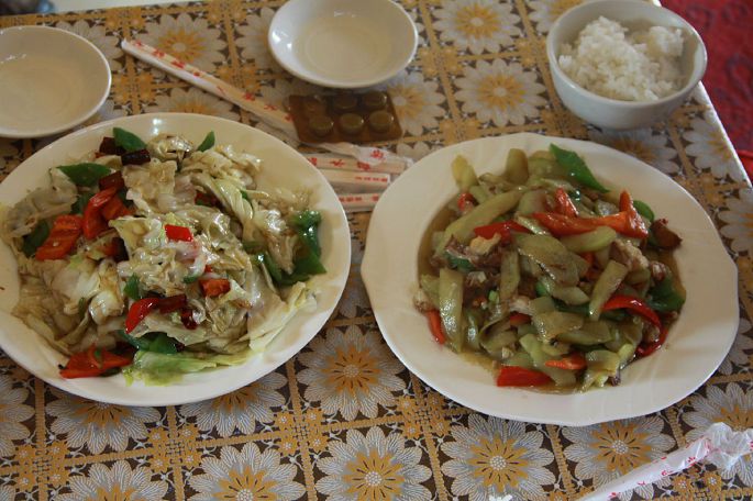 一盘包菜,一盘西葫芦肉丝,一盆米,用了一张“毛爷爷”。