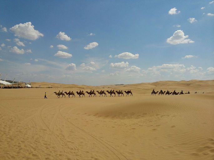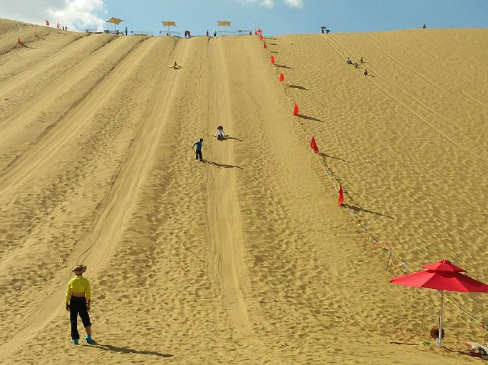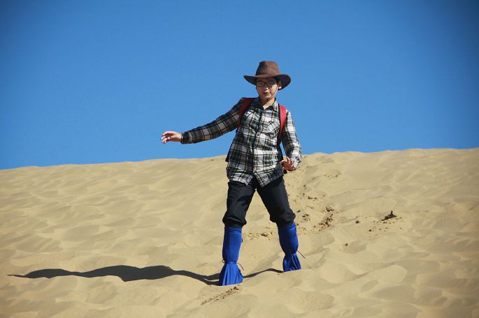 一早起来在门口吃过早餐(44元),又准备些干粮和水,就精神百倍地奔向响沙湾。熟门熟路,十几分钟就到了,明显地比昨天用时短。一到售票处直接选择门票+索道130元+仙沙岛140元的套票 。景区下去到索道的大巴还没有开始运行,我们也不等待,反正下坡路自己走吧,最多十分钟路,早点进去喽。一早索道处就排队了,幸好用时不多。索道帮助我们穿越下面干枯的罕台河道。10元钱套上一双靴子似的布鞋,美名其曰“沙袜”,实践证明效果杠杠滴。满目皆沙子,终于站在沙漠里了。响沙湾的沙子细腻就如盐粒一般,干干净净的不沾染灰尘。刚接触沙子的人们就舍不得向前移动脚步了,冲上身边的沙丘,没几下脚步就沉重起来,明显地脚步跟不上放飞的心情,干脆一屁股坐下,仰望蓝天,露出一口皓齿,靓起嗓子。沙丘一下子就俘获住了游人的心。在沙漠里快唱一句:我要飞得更高。。。似乎飞的还不低哦。