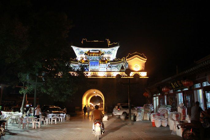 从鄂尔多斯向南离开内蒙古就到了陕西境内的榆林。我们赶到榆林的时候,天色已擦黑,寻觅到新建北路水桥畔下巷的天虹宾馆(0912-3363222,标间118元)落脚 。简单地卸掉从响沙湾带来的风尘,步行几分钟就到了鼓楼。这附近的特色饮食很多,我们品尝了凉皮,和家里不一样的口感和味道,很好吃的。从北大街溜达下去,小街的两边布满了各色小店,让人好奇的是有N家的布店,看来布店的生意好做。北大街上向南还有钟楼、星明楼、万佛楼。一个个都是腰缠霓虹头戴射灯,装扮的分外耀眼,恢弘着老城的一片夜幕。