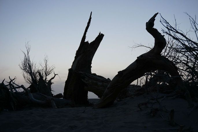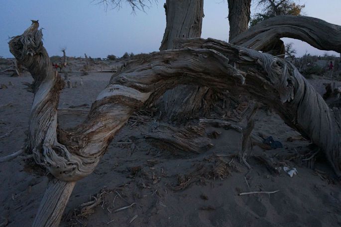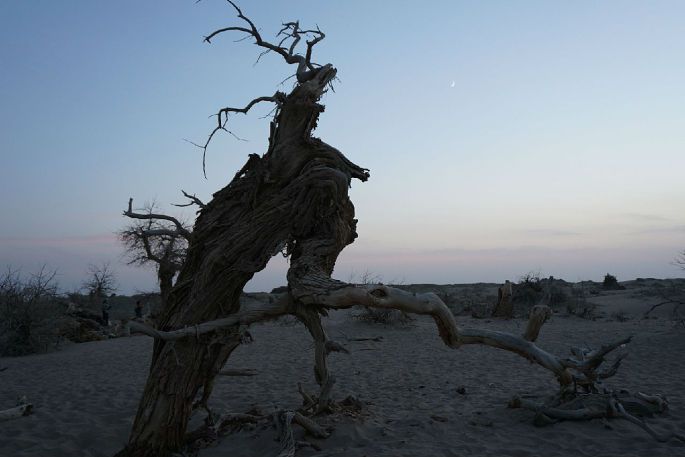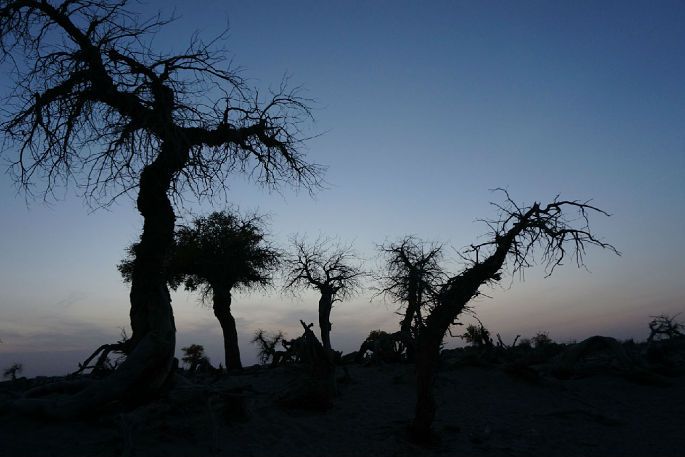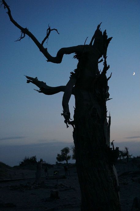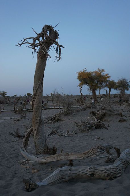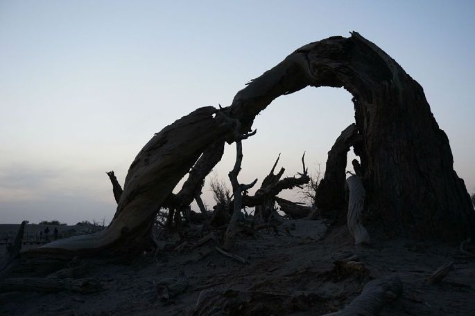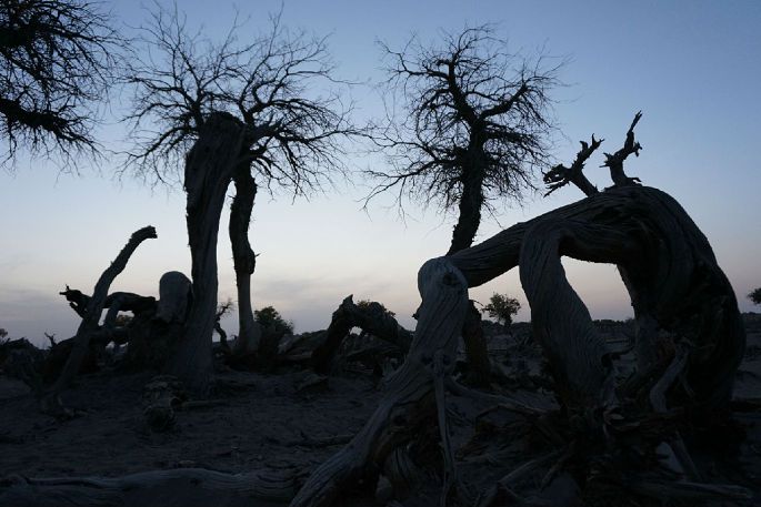 怪树林犹如古战场,仿佛曾经发生过一场殊死的恶战。枯死的胡杨奇形怪状,有的像被砍去头颅的士兵、匍匐在地,躯体在蜷曲;有的斩腰断臂,粗厚的树皮如盔甲连着骨肉;有的剖腹不倒,靠在金戟一般的枯树旁,坚强到令人难以置信的程度———其形难以名状。相传“怪树林”有一个悲壮的故事,说是一位将军率军从城中突围来到当时还浓荫丛密的“怪树林”,而西边滔滔弱水河却挡住了他们的去路,于是一场恶战,烟消云散,古战场成为历史的永恒。苍凉的“怪树林”,据说是将军及众将士不死的灵魂所在。