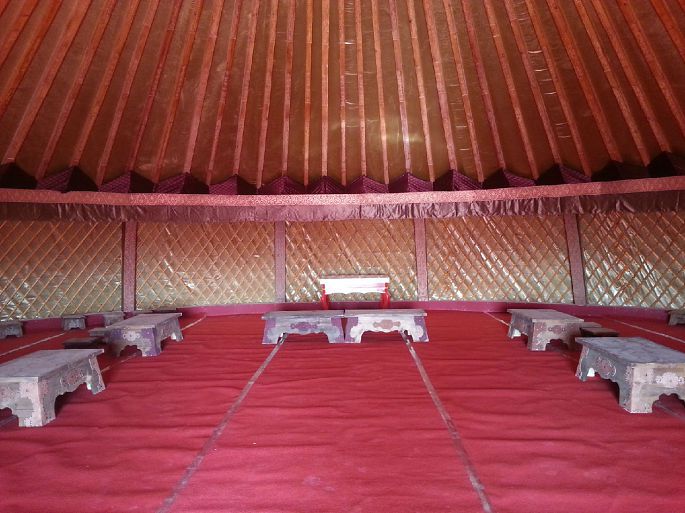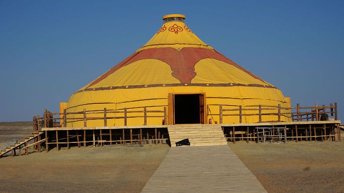 居延海的另一侧仍是戈壁滩,一条木头栈道通向一个孤零零的蒙古包(给游人参观用的)。在这茫茫戈壁上,居延海犹如一块晶银剔透的美玉,漂亮而珍贵。