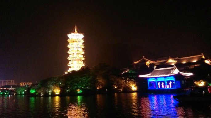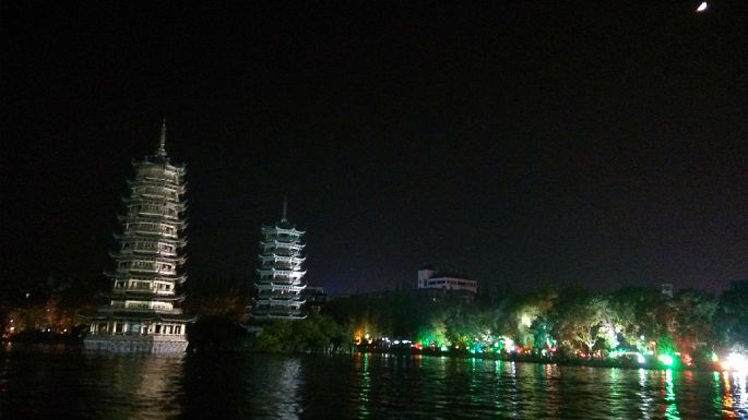 2014/10/1 30日晚9:30从福田汽车站出发,第一次节假日出行,没有经验,就悲剧的堵车到1号晚上六点多才到桂林,之前已经定了晚上8:05夜晚两江四湖的船票,稍作休整后就去了解放桥六匹马码头,船票非临窗位置,游览顺序是漓江——4内湖——桃花江,在内湖阶段船尾是开放的,此阶段本人就一直呆在外面,船内全程有导游讲解,另提供摄像付费服务,全程可以看到叠彩山、伏波山、日月双塔,耗时一个小时20分钟。住的是体育馆对面的樱特莱庄园小区内的桂林小巷子青年旅舍,8人间(73元/床位),有空调,小别墅,新开的,很干净,公共卫生间空间很大,老板为两兄弟,河南人。