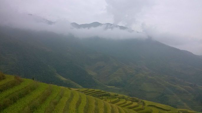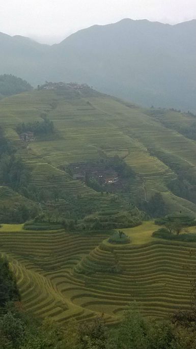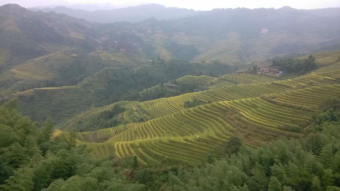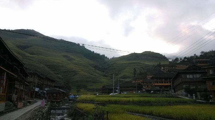 下午去桂林琴潭汽车站做班车去了龙胜,耗时2个小时多在和平乡加油站(近龙胜县城)下车,换成去龙脊梯田大寨的中巴(路经平安寨入口),上山堵车严重,硬生生的从1个小时变成3个小时,后来在阳朔听闻还有耗时8个小时的悲剧童鞋。达到终点站大寨停车场已是晚上6点多,入住的是田头寨的龙胜金坑国际青年旅舍(240元/观景房标间),差不多要从停车场爬50分钟才能到达,不过已经是你第一家看的的旅店了O(∩_∩)O~。旅店木质结构,晚上有点吵,山上的旅店都是一样,晚上提供电蚊香,一层双公卫,有空调。晚餐直接在旅舍吃的,可以点农家的竹筒饭和竹筒鸡,旅店的菜单写错了,把竹筒鸡的准备时间40分钟写成了4个小时,错失美味。