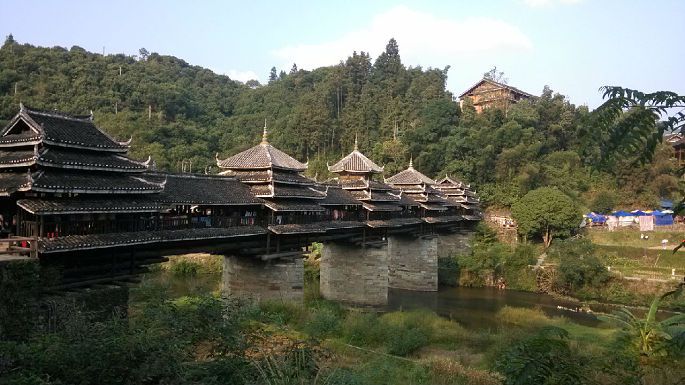 在景区内闲逛,看看程阳桥、程阳八寨、侗族鼓楼,个人感觉就一乡下农村,还是现代和古代建筑,完工和未完工建筑混杂在一起。晚上有百家宴(收费),篝火晚会,吹笙表演,纺纱等表演。