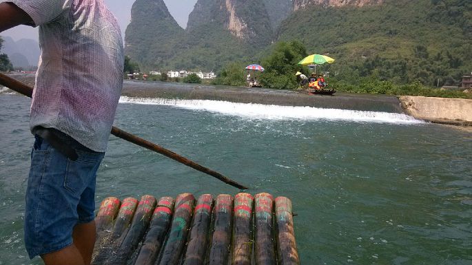 11:30上的筏子,没有预定要等待30分钟。楼主一上去就开始发呆了,一路竹林,河水,远处的山,以及很小很小的落差,辜负了”漂流”两字,午餐被狠狠地宰了一刀,=。=。景色其实不如漓江的。