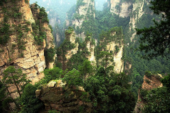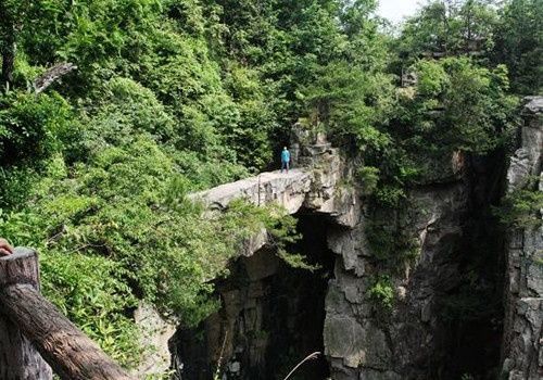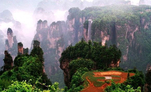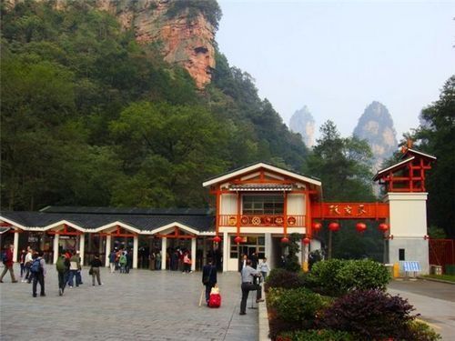 路线:金鸡报晓---动物聚会---乌龙寨大门(门口有个很特别的水车式样的玩意,我称之为五人翘翘板,很好玩的东东)---对不起(谁敢不低头,谁敢不弯腰,一夫当关万夫莫开)---土匪窝---天波府---藏宝洞---一线天---空中走廊---一步登天。注: 从景点的名称就能看出乌龙寨易守难攻。另外,风景漂亮不说,还挺好玩的。我们一会儿挖宝,一会儿磨沙子,还试了试回声。我甚至丢了块石子试了试一线天的深度,石子碰撞的响声连绵不绝,小小的一线天洞深不可测啊!中午在乌龙寨附近的餐厅吃自助餐,味道还不错,再次拍照存证。 餐馆是小陈导游的亲戚开的,所以我们受到了特别的优待,菜很多,上菜速度也很快,还附赠饭后的水果(山里的野生弥猴桃),让周围吃饭的其他人羡慕不已。10月8日下午:游览天子山神堂湾和贺龙公园 路线:[神堂湾景区] 巨大的天子脚印和马蹄印---神堂湾向王天子跳崖处---神堂湾天然大门(由石峰形成,很壮观)---点将台---乘环保车至[贺龙公园贺龙铜像---试情石(西游记三打白骨精的拍摄点)---西海石林(石船出海,御笔峰,仙女散花等)注: 在杨家界遇到了N多的韩国旅游团,大都是老先生和老太太,而且人数极多,让我一时间感觉好象是在韩国旅游,我们几个才是外国人。 10月8日傍晚:游览老屋场(老屋场位于天子山景区,是小陈应我的要求特别添加的景点) 路线:山谷回声---神兵聚会---空中田园---百龙天梯(远观)