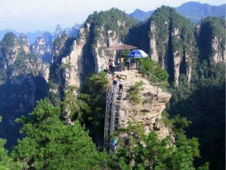 路线:大观台---神鸡啄食--- 天子座(相传土家向王天子打坐的地方)---仙人桥 ---一步难行;注: 这天下午的景点除了大观台外都是传说中的天险, 尤其是仙人桥和一步难行, 据说都曾有游人失足落崖而死,而且还摔得胳膊是胳膊,腿是腿。同伴莲子有点恐高,再听了那些恐怖的故事,过“一步难行”时腿都软了。不过无限风光在险峰,风景真的是没话说!10月8日上午:游览杨家界景区的乌龙寨(就是以前的土匪窝)