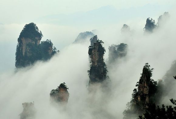 注:老屋场是我从网上驴友的推荐中发现的,很少有游客知道,为此让小陈惊讶了一把,也让本人很是得意。路很不好走,老张理所当然地放弃了,回旅社休息。我们两个女的,莲子跟我兴致勃勃地去了,果然没后悔!那是另一种难得的经验,象个真正的山里人那样走未经修整的山中小路。辛苦到达目的地时,内心有种说不出的自豪和满足,好像是挑战自己成功了一样。导游说,那是因为我们可能骨子里也有股山里人的野性。特别喜欢山谷回声,我的喊声在群山环抱中回转,由近至远,重复了七八次之多。特过瘾!!!其实在乌龙寨的土匪窝,也有回声的,只是声音虽清晰却无法持续这么的久,传得这么的远。 晚饭在温馨家园客栈吃的,小陈的妈妈下厨掌勺,都是当地特色的土家菜肴,酸辣口味。我自然不会放过,开吃之前先把美味的东东拍下来,就连小陈妈妈在厨房灶边忙碌的身影也没放过哦!一切都是为了将来美好的回忆嘛! 10月9日:在张家界景区的最后一天,所以只好辛苦一点将剩下的景点一网打尽,游袁家界下乱窜坡走金鞭溪。10月9日清晨于大观台看日出:我和莲子一大早就摸黑起床,走去大观台等日出。我们从五点等起,可怜那太阳七点才出来。山里清晨的温度又很低,把我们俩冷得,那感觉只能用美丽“冻”人来形容。闲极无聊,我们拿出相机,从星星拍到太阳,从清晨的山雾拍到日出的云海,从树梢间的月亮拍到蓝天上鱼鳞状的满天云朵,就连日出前的冷得哆嗦,互相都没放过,一一留影。 约8:15出发,离开住了两晚的营地,还真有点舍不得呢! 10月9日上午:袁家界阿凡达外景拍摄地。 路线:天下第一桥---神龟望天---五女出征---迷魂台---试剑石---后花园 --- -金鞭溪 ----国家森林公园门票站。中午在迷魂台餐厅吃饭。10月9日下午:下乱窜坡走金鞭溪到国家森林公园门票站再搭车到张家界市内中心汽车站