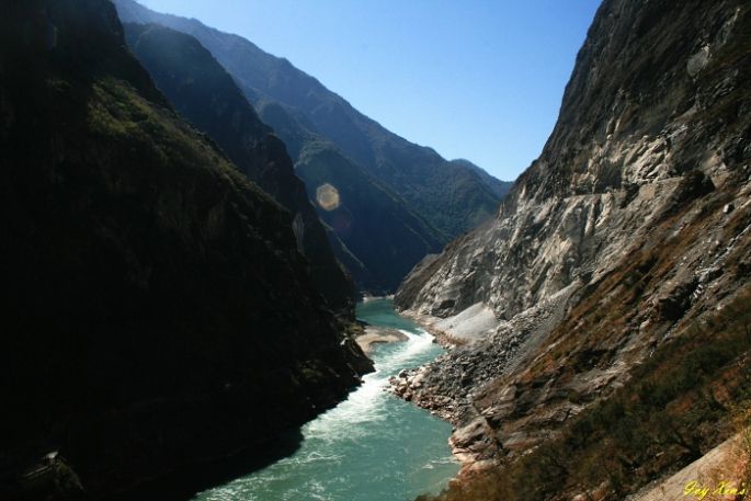 上午的路线图是去虎跳峡,这是一个比较有名的地方,共分为上虎跳、中虎跳和下虎跳,作为暴力游的爱好者,我们原本是希望去中虎跳徒步的,后来修路原因,我们去了上虎跳(比较节省体力,观看虎跳石),上虎跳其实是一段维修的相当好的路线了,沿着河岸在走,要注意2侧的岩石滑落,其实路途比较单调,大概1小时能到虎跳石,然后返程,不过虎跳石如果在汛期,应该还是蛮不错的!~领队石头跟我们说,徒步要注意的小细节,走路不拍照,拍照不走路,挺实用的。师傅阿星哥,跟我们说,每年雨季很危险,虎跳峡全是落石,泥石流,我看着窗外,心慌慌呀~