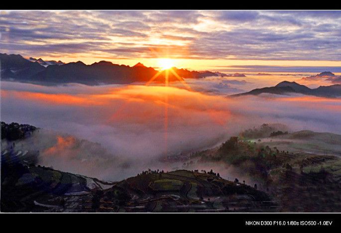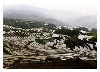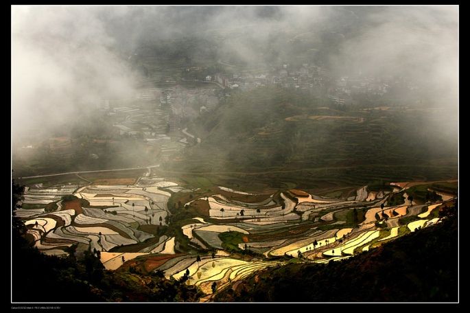 NO1:五月中旬(端午前后),此时正是晚稻插秧季节,所有的梯田都好整以暇,并且放满了水,看上去,从山头至山脚,镶满了形状大小各异的镜子,别有情趣。