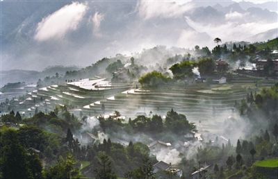 梯田是茗岙山水的一绝。幽谷云海浮涌,山村枭枭炊烟,成片梯田依山而建。在烟雾迷蒙中看层层梯田如同来到了天外仙境。到这里的无论是游客还是摄影师无不被眼前那秀美亮丽的田园风光和清新古朴的自然环境所陶醉。茗岙的梯田风光一年四季都有不同的特点和魅力。