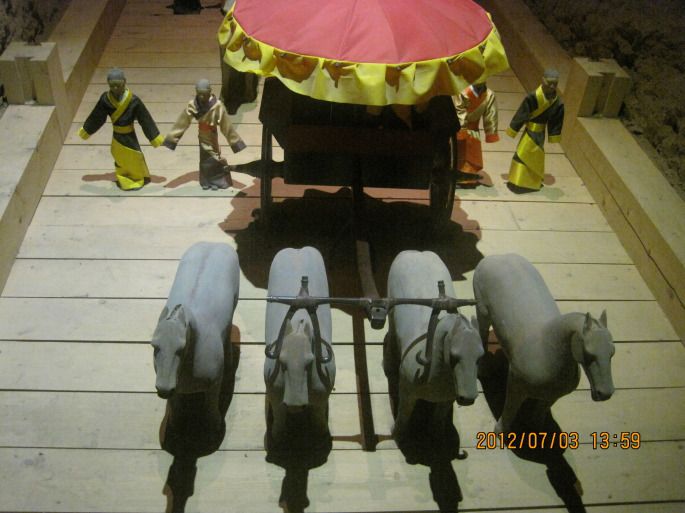 阳陵。坐K600路公交,钟楼上,张家堡下,赶时间没有等游4,打的去汉阳陵。打表29.6元,往返过路费20元,一共50元,司机还能从景区拿到我们购票的回扣15元/人(前提是买全价票)。汉阳陵是汉景帝的陵墓,正在整理发掘的是他的丛葬坑。汉阳陵博物馆就盖在这些丛葬坑上面,使用玻璃地板和墙壁,既使游人能近距离观赏,又有效保护了发掘现场和文物。博物馆里很黑,坑里的陶偶七零八落的倒在地上,近视眼看的很辛苦。蹭导游听才知道:坑道原是木头搭建,上覆泥土,木头腐朽后土落下来砸倒了陶偶;陶偶原本是穿着衣服的,木质手臂便于穿脱和活动,后来手臂和衣服全部腐朽了,只留下陶制的身体;但是古人的精细在于陶人的身体完全按真人制作,连细节也不放过,没有衣服的遮盖,男人、女人、阉人,一眼便明。陪葬品中还有大量动物陶偶,猪、狗、羊、牛、马、鸡样样齐全,汉景帝真是爱吃啊。古人事死如事生,丛葬坑是按照西汉