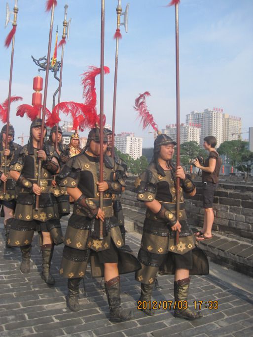 16:00售票厅外坐游4回到张家堡换K600南门下到了城墙,儿子有些晕车,在外面的长凳上坐了一会儿。在我劝说下上了城墙,刚上去就看到了古装表演:一队身穿铠甲的武士,手持长戈列队巡城,在