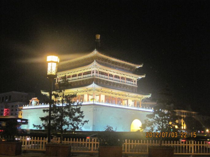 出来刚好撞上小S母子,她们买了些纪念品正往回走,于是一起回宾馆,路上看到“八宝镜糕”,糯米粉蒸的,沾上花生和糖,甜甜糯糯。走出回民街,夜色下鼓楼和钟楼金碧辉煌,非常漂亮。第一天结束。