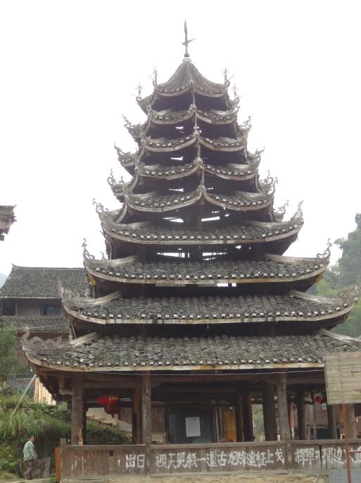 芋头古侗寨的确很有特点,侗屋沿着芋头形状的山坡而建,错落有致。青石板路通往各家,石阶路在侗屋中蜿蜒,沿着石阶路慢慢走,从这家的门口走到那家的院子,从这家的水塘走到那家的屋后。抬头看去,牙上鼓楼如悬空而建,鼓楼建在一个平面上,这个平面好像从另一个平面平悬延伸出来,立柱支撑一个大的平面。走上去看,发现牙上鼓楼尽管也是悬空而建,但与山西的悬空寺不一样。山西的悬空寺靠崖悬空,下有立柱支撑;牙上鼓楼建在一个悬空而出的平面上,鼓楼门口有一片空地。