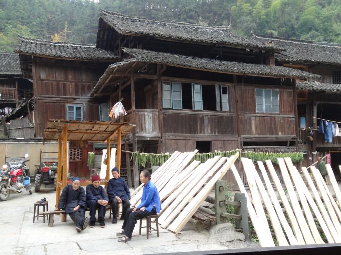 鼓楼里有几位老婆婆摘菜。和她们语言不甚通,就坐在一边帮助她们摘菜,是一种略有生姜味道的茎,将外面的老皮撕掉,里面是水嫩的芯,沁出清香。默默地摘着菜,听她们间或聊天,脑子空白,心静如水。