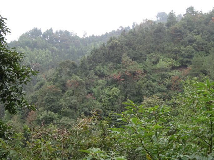 从芋头村出来到红香路口,一路下行,路两边秋色初染,夏色依然。林木茂密,深沟流水只闻其淙淙。坡上和沟底偶见小块田地,刚刚收获过,露出了土黄的地面。柿子正好熟了,女人和孩子们欢笑着摘柿子,失手的柿子掉到地上,一滩香甜。