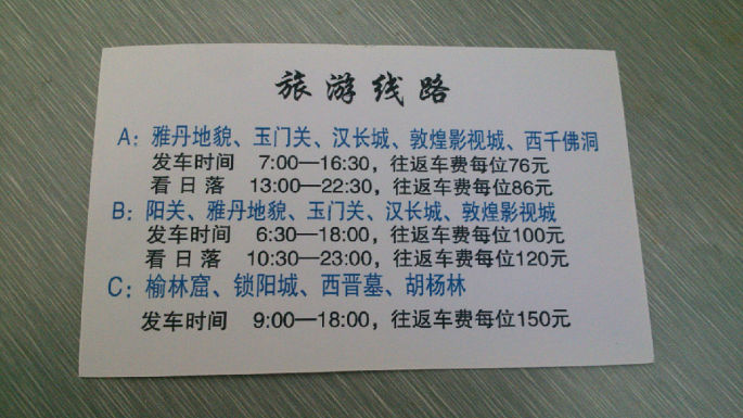 傍晚六点他们回来,在公路口,等不到去市区的公交,大家以后也不到搭公交,打的吧。公交是坐不上的。4人一车90元,送我们到张掖火车站,夜里一点多的火车到敦煌。