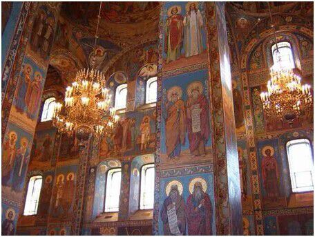 午餐毕,H告诉了我下午的行程,还递给我一部ipad,上面有滴血教堂在童话里的插画,在一些电影里的节选片段,还有一张电子明信片可以让我填写。我想来想去,也没谁可以寄,就寄给了爸妈和自己。滴血教堂也不远,很快到了,里面依旧是冠冕堂皇,听说国内团是不进来的,有点可惜,虽然没有太了解东正教历史,但这些文化瑰宝还是值得一看再看的。