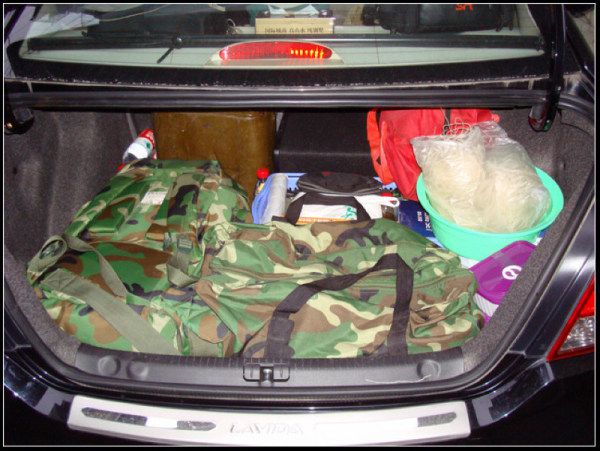 整装待发,这只是我一个人的装备,已经塞得很满了,到了集合点还要增加两位美女的行李,这是我的黑狼第一次承受这么大的重量,真怕它到了高原吃不消,不过经过实地检验,我的黑狼还是挺强壮的,除了右后窗摇升机发生故障外,其它都一切ok。