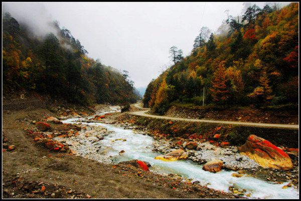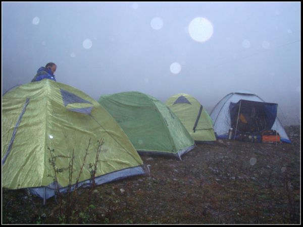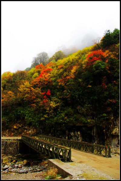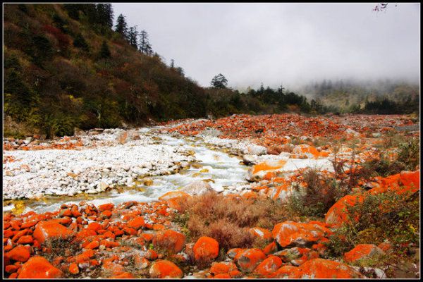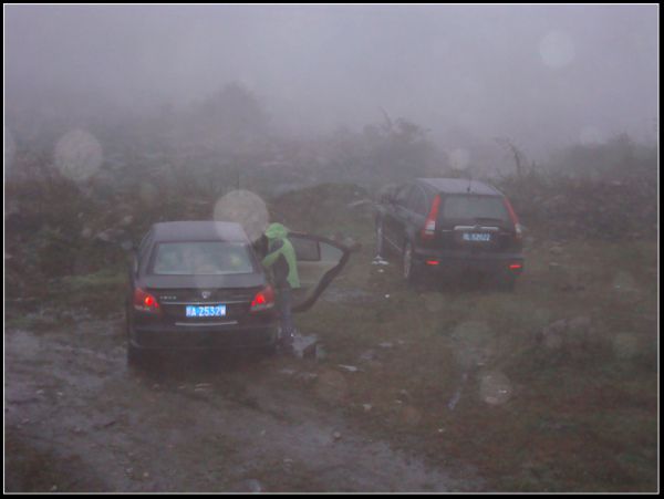 继续前行,沿雅加梗到达海螺沟,来到红石滩,大雾弥漫,能见度10米。