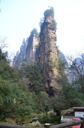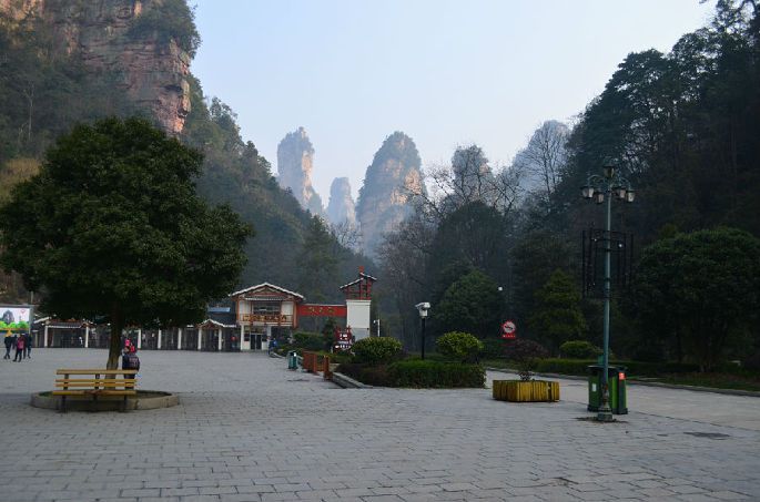 火车早上9点多到的张家界,刚走到出站口,就看到娟子安排的帅哥导游朱导举着我们姓名的牌子在出站口等着我们,来到这个陌生的城市,有人接的感觉很温馨、很鸡冻哈!接着朱导带我们去吃了当地的特色早餐——米粉,据说张家界人早餐大部分都吃这个,吃完早餐直奔去森林公园的汽车站(早先自己查2014年张家界的攻略看到说汽车站是到市中心,据娟子说汽车站12年初就迁到火车站旁边了--攻略也不可全信啊),坐上去森林公园的车,40多分钟就到了公园门口,趁着朱导为我们去买票,门口先来张吧!