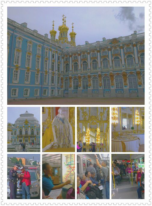 我们一行人一早从酒店出来徒步前往地铁,几经询问才找到地铁M2线入口;搭乘地铁出来后又换乘了K782大巴,上车后感觉环境特别熟悉,仔细观察才发现这是辆宇通牌公共汽车,是中国造。12:00一行人进入了叶卡捷琳娜宫。宫殿天蓝色的外表耀眼夺目,色彩清新柔和;宫殿内部个个富丽堂皇的厅室成为巴洛克风格的经典之作,其中的琥珀厅被称为世界第八大奇迹,绝美惊艳。花园中,英国式园林无处不弥漫着花草的芬芳;皇宫教堂那五个圆葱头式尖顶在碧空下金光灿灿,几乎从园内任何地方都远远望得见。叶卡捷琳娜宫于1990年被列入联合国世界遗产名录。我们租用了自助导讲机(150卢/个),听了很多关于宫殿的厅室建造、陈设设计、众多画作的详细介绍。