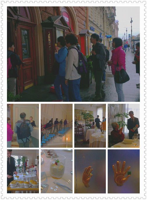 沙皇俄国时代的上层人士非常崇拜法国,饮食和烹饪技术也主要学习法国。经过多年的演变,特别是俄国属寒带,食物讲究热量高的品种,逐渐形成了自己的烹调特色。既然我们来到了这片热土,品尝俄式大餐那也是必不可少的一个项目。一大早出来走了几个教堂后,大家又累又饿,一行人沿着涅瓦大街寻找用餐的地方,最后去了勤姐推荐的网上热荐的一家俄式餐厅。真的名不虚传!首先,用餐前需要“洗漱更衣”,有人开玩笑地说就差净身了。大家将该脱的该存的衣服和包存好,在大更衣镜前将已经凌乱的头发梳整好后,被带到另一个空旷的高挂着水晶吊灯的大厅,沿着左侧宽敞的高高的楼梯拾阶而上,个个“衣冠楚楚”地步入了二楼的餐厅里。进去前以为里面是个宴会大厅,进到里面才知道其实仅有十几张餐桌,绿植环绕其间,环境格外优雅,餐厅右侧墙边有一台老式留声机特别引人注目,我们进去时只有靠里的一张餐桌有客人在用餐,20人的我们是大户,自由组合成了五桌落坐。另一个让人惊艳的地方是餐厅卫生间的标识,较为粗大的手执一块碧玉的门把,是男厕,纤纤细手,手执一颗晶莹珍珠的门把,是女厕,好有品味的感觉呀。用餐过程更不用说了,服务的全部是高大上的帅锅,餐具特别精致,一道餐全桌人用完才会收盘再上另一道餐,其中有一道炖品,介绍说炖了48个小时,每天限量供应;印象中主菜是烤制的鱼,需要混合着蘸汁一起吃,不喜欢蘸汁单吃鱼会比较腥;还有一道有鱼仔酱的冰淇凌,味道很别致。这顿大餐人均1830卢,约合人民币350元。餐后,华茹大哥自言自语地说“不如北京的炸酱面好吃”,听后大家一片哗然:)
