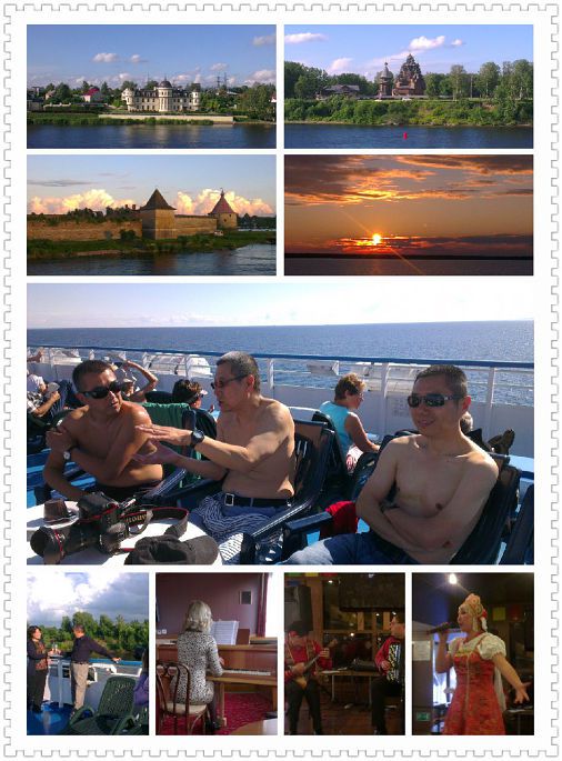 船舱外的景色就更不用说了,人在画中游,白天尽情游览俄罗斯陆地、小岛上的建筑与风光,在甲板上享受日光浴;夜幕降临时,欣赏夕阳下彩霞映照的俄罗斯,美仑美奂。游船经过了俄罗斯的五大湖:涅瓦河、拉多加源、奥涅加湖、白湖、伏尔湖,中途停靠的小岛也各有特色,景色怡人。