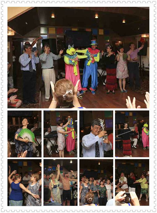 7月10日游轮将到达莫斯科,船公司还有组织两日游,但有一些游客将下船结束他们的旅程,所以在到莫斯科的前一天晚上,游轮方举办了全体游客参加的联欢会(Talent Show),各国的游客都参加了表演。其中,我们中国团队的表演丰富多彩,**的魔幻彩带、辘辘的魔术绳、朱哥的神奇报花,上海团队的魔术、二人转、二重唱、新疆舞,尤其是骆老师表演的独具中国特色的舞蹈“茉莉花”,其优美的舞姿与动听的音乐赢得了阵阵欢呼声和热烈的掌声。另外,荷兰团队表演的拔罗卜、西班牙团队表演的探戈群舞、丹麦团队表演的两只老虎合唱等节目风趣、幽默、热闹,引得观演现场阵阵笑声与欢呼声。