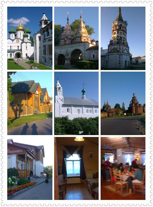 苏兹达尔建于公元9至10世纪,它曾经是俄罗斯第二大政治及宗教中心,后来随着俄罗斯政治中心的西移,苏兹达尔逐渐隐没,成为一处与世无争的世外桃源。目前城内虽然只有5万人,却有25座教堂、11座修道院和17座钟楼,都是12世纪和17世纪的建筑。目前苏兹达尔以其众多的名胜古迹和优美的自然风光,被列为世界遗产保护区,虽然很多宗教建筑都已被列入世界自然文化保护遗产但是大部分教堂并不收费。我们驾车沿着卡缅卡河走走停停,游览了小克里姆林宫城堡、18世纪木制的鱼鳞片式的圆顶教堂,看到了法衣存放修道院、凹角锥形状的钟楼,参观了波克罗夫女修道院和市区北边苏兹达尔规模最大的斯巴素—叶夫菲米男修道院,还有无意间看到被绿树环抱的二战纪念墓,战士的头盔和长明火依然打动人心。一行人或驾车或徒步,游走于古城堡、农舍、河岸、桥头、教堂、修道院,尽情感受苏兹达尔小镇的宁静与古老。其中,城内的木质建筑也非常有名,几乎所有公共设施与民居都是木质的。近距离观赏木质结构民宅,屋檐和窗框上有着精美的刻花雕饰,在木制篱笆后面,每栋房子都按照主人的喜好刷着不同的颜色,这些星星点点的木屋形成了一道亮眼的风景。我们住的就是这样的木屋酒店,满屋飘着松木香气,窗帘、床上用品采用俄罗斯风情布艺,门廊的天窗散射的阳光撒在壁炉前,特别温馨。酒店不大,但干净、舒适,尤其早餐也特别丰盛、好吃。总之,苏兹达尔小镇给大家留下了非常非常深刻的印象,我们爱上了这个散发着中世纪童话般气息的小镇。