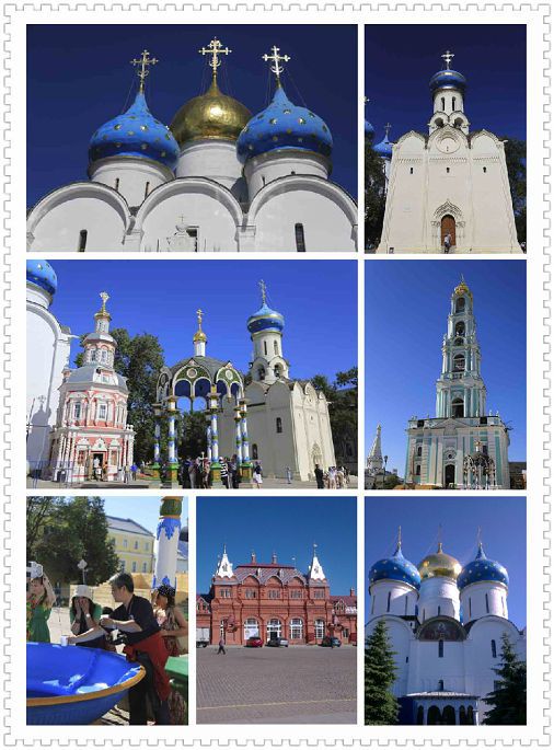谢尔盖耶夫是莫斯科的卫星城市之一,建成于14世纪,它是俄罗斯的东正教中心,在东正教中的地位就像是天主教中的梵蒂冈。谢尔盖耶夫最值得看的古迹是圣三一大修道院,它是俄罗斯最古老的大修道院之一,1993年修道院被列入世界文化遗产名录。圣三一指的是圣父圣子圣灵三位一体。圣三一教堂群包括圣三一修道院、圣三一教堂、钟楼,白石斋房、圣水池等。其中最著名的是圣三一教堂,它建于1423—1442年,在4个洋葱头形的蓝色圆顶中央有一个金色的大圆顶,是俄罗斯早期建筑的典范。圣水池周边排着队,十字形的喷头涓涓涌出圣水,听说虔诚的信徒不远万里来这接圣水,传说用这里的圣水洗眼,可以让眼睛更加明亮,于是我也排队去洗了喝了,水很清凉。在这里,我们再一次聆听了唱诗班用无伴奏和声颂经,,由于教堂大厅有很高的穹顶,歌声在空旷的大厅回荡,声乐效果十分优美动听;虽然什么也听不懂,但演唱,能让你驿动的心平静下来。