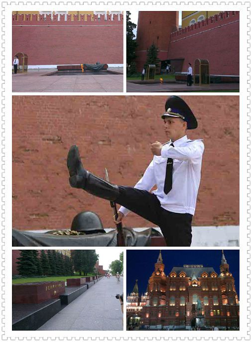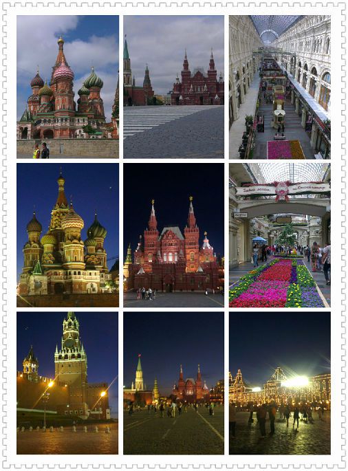 红场,古语为“美丽的广场”,位于莫斯科市中心,是“莫斯科的天安门广场”,感觉没有想象的那么大,听说只有天安门广场的1/5大小。它的西侧是克里姆林宫;东侧是GUM百货大楼,1893年建成的世界知名十大百货商场之一;南侧是瓦西里升天大教堂,九个色彩艳丽的“洋葱头”圆顶色彩斑斓,是俄罗斯最美丽的教堂;在教堂的前面是民族英雄米宁和波扎尔斯基雕像,雕像的右前方有一个圆形的平台,俗称断头台,是红场上最古老的建筑;红场北侧是国家历史博物馆,红砖银顶;博物馆前竖立着前苏联卫国战争时期的英雄朱可夫元帅骑马的雕像;旁边是无名烈士墓,列宁墓位于靠克里姆林宫墙一面的中部地下,墓上为检阅台,两旁为观礼台。红场西临莫斯科河,鳞次栉比的优美建筑与河岸、水中倒影构成了红场独特的美!特别是华灯初上的傍晚,红场在暗淡天光 “魔鬼蓝”的衬托下,条石铺成的广场地面反射着青光,显得古老而神圣。此刻的红场有种特别迷人动人心魄的美丽,真的无法用语言表达。所以,有些旅行团都是安排在晚间游览红场。