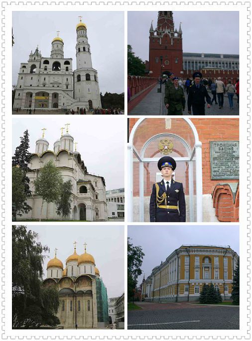 克里姆林宫是当年沙皇的宫殿,始建于1156年。为了保护沙皇,它四周砌了围墙,围墙上又砌了高高的塔楼,用来瞭望和防御,围墙和塔楼都是赭红色的,与北京紫禁城围墙的颜色很相似。克里姆林宫内有四座宫殿、四座大教堂和十九座塔楼。它有五个城门,这五个城门的塔楼特别大都是尖顶,顶上装了红星。从下面看上去,好象红星并不大,实际上红星直径有