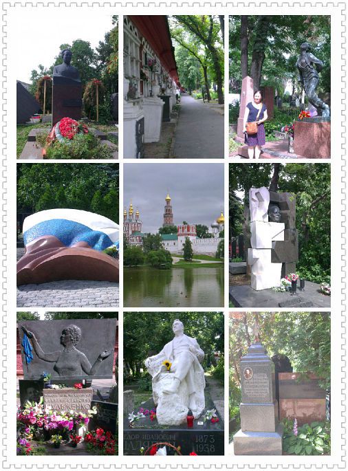 在莫斯科南郊,有一座美丽的女修道院,名叫新圣女修道院。它座落在河边,粼粼水波上倒映着丛丛绿树和红墙金顶的教堂、钟楼,犹如世外桃园。这里的女修士们大都来自皇室家族的女贵族,其中彼得大帝的姐姐索菲娅也曾经是这里的女修士,她是因为涉嫌叛乱,被囚禁在这里的一个单独小屋。我们一行人赶往这里,主要不是为了参观新圣女修道院,而是前往它旁边的新圣女公墓。自1923年起,新圣女公墓成为名人公墓,它之所以闻名遐尔,是因为有许多俄罗斯名人长眠于此,与其它公墓不同,它需要买门票才能入内。步入公墓,有几条平行的道路,道路两侧古木参天,道路与道路之间便是公墓。这是一座高档次公墓,在每一座墓前都竖立着墓主的雕像,或全身或半身或头像,形态各异,几乎每一个墓碑都是一个雕塑艺术品。赫鲁晓夫墓与众不同,由黑白两色大理石搭叠而成,中间是石雕头像,据说这象征着他一生功过各半;我们还特地找到卓娅墓,女英雄卓娅双手被紧缚在背后,衣衫破碎,挺着裸露的胸膛,头高高的向后昂起,感人至深;王明的墓也在这里,一尊半身雕像,身穿中山装,两眼直视前方;在一个显著位置还看到了叶利钦墓碑。