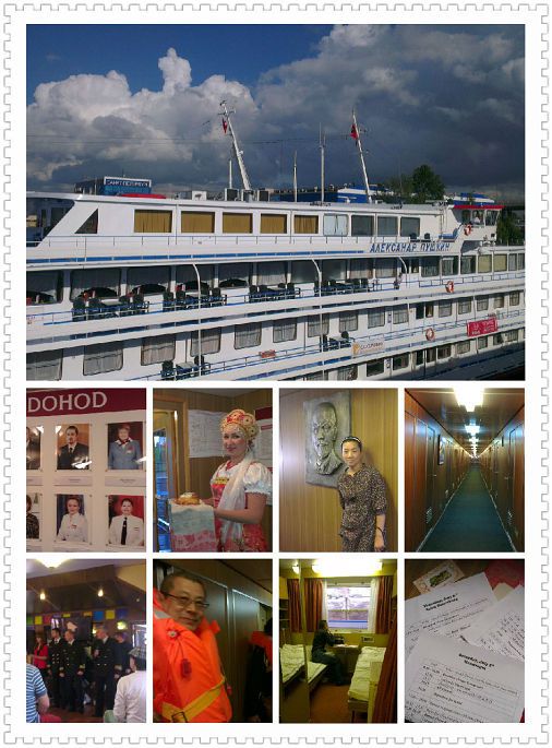 我们乘坐的游轮名字叫“列宁号”,听勤姐说是“德国造”,专为在伏尔加河上航行而设计的,我们将从圣彼得堡出发驶入伏尔加河,驶向莫斯科。整条船一共有五层,最下面在甲板下面那层是工作人员休息的地方;客房都在二、三、四层;我们20个人分别住在二层和三层,所有的客房都能看见风景,有淋浴设备的卫生间24小时供应热水,房间里有空调、衣柜、搁物架;房间虽然不大,但住在里面还比较舒适。另外,每个房间都装有一个小喇叭,每天清晨都会从里面传出向大家问好的Morning Call,并全天播放悠扬的音乐,播送每日用餐、各项活动的通知。