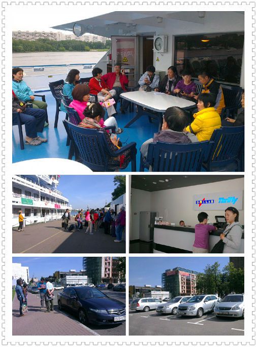 一行人下船没有停留,游船公司安排大巴直接将20人送到了DOLLAR THRIFTY 租车点。关于租车还有小插曲。出国前约定租5辆车,需要5名手档车司机提前办理驾照公正及信用卡,他们是占哥、朱哥、涛哥、保哥和向哥。但在俄罗斯旅行发生的偷窃事件导致朱哥的信用卡被偷;保哥在国内没来得及办理信用卡;向哥最逗,在国内早早地办好了驾照公正及信用卡,信誓旦旦一定体验一把异国自驾,但出来时没带驾照,以为有公证书就可以了。这样一来5个预定司机有3个有问题了。面对突发情况紧急磋商,涛哥和钟姐动用儿子关系,在莫斯科当地借了一辆车;勤姐关键时刻又显“英雄”本色,出国前她也办了驾照公正以备不时之需,这样一来至少可以保证有4辆自驾车。好在租车时,DOLLAR THRIFTY没有特别纠结信用卡与司机的关系,最终租给了3辆雪佛兰、1辆斯科达(379元/天,加上借来的一辆本田,我们还是开着5辆车上路了:)