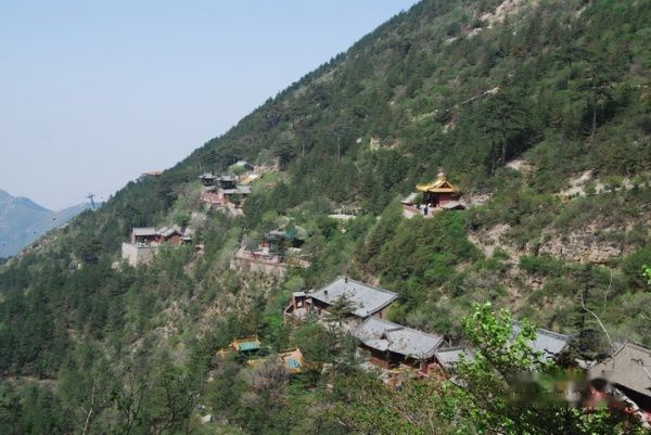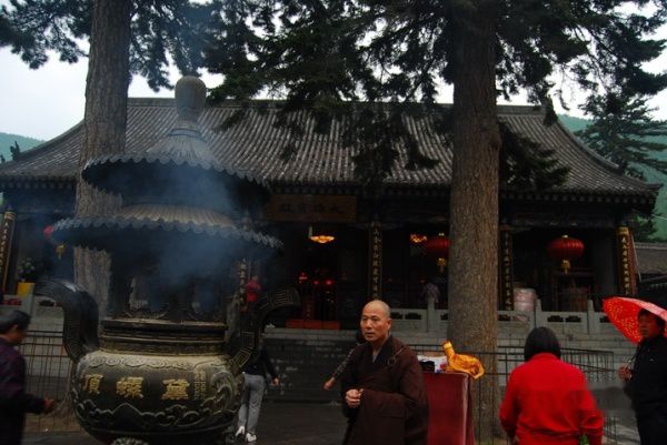 早上起来,还是在宾馆餐厅吃的早餐,15元一位,感觉还可以,营养卫生。然后开车去黛螺顶,天公不作美,下雨并伴有雷电,坐不了索道(索道上行50元),只好自己爬上去了,看起来不算高,但1080级台阶着实让我狼狈不堪,用了一个小时才艰难的上来。把五台山的五个台(也就是五个山峰)都走一遍叫大朝台,体力好的也要二天的时间,也可以只上黛螺顶朝拜,因为那里集中了五个台的菩萨像,叫小朝台。我不信佛教,但上来了,还是拜了一下五台文殊菩萨(东台聪明文殊、南台智慧文殊、西台狮吼文殊、北台无垢文殊、中台儒童文殊),求个平安。