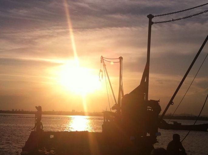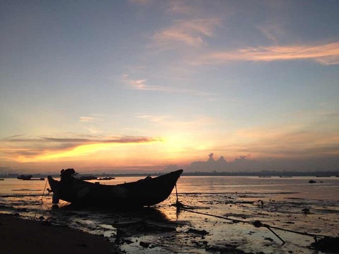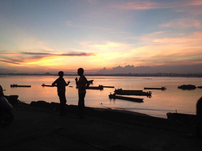 当地渔民在彩云下聊天,抽着烟,多惬意。