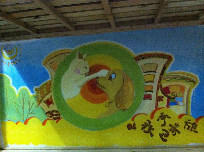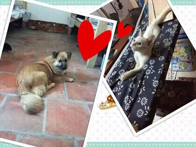 而后应店长的要求我画了青旅里面的两只动物,一只狗夭夭,还有一只猫咪灼灼,这两只是店长很喜欢的,所以我把它们画在一起了,相亲相爱的猫咪和狗狗。哈哈