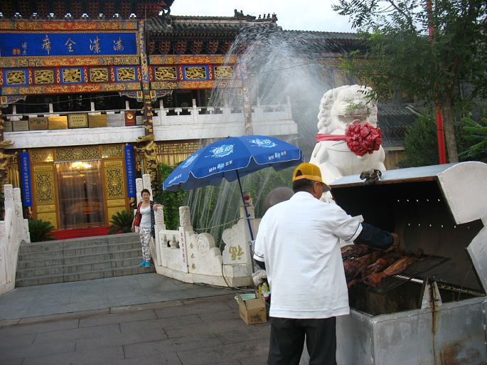 进入景区,首先解决吃的问题,路过赛罕塔和月亮湖,大家没有下车,留回来时再欣赏。在月亮山庄休息,吃饭。要了当地特色,手把羊肉,柴鸡炖蘑菇,有一种饼,干干巴巴,颜色也不好看,也不知是饿了,要了10张后,又要了10张,大家都说好吃。整顿饭下来真TM贵。